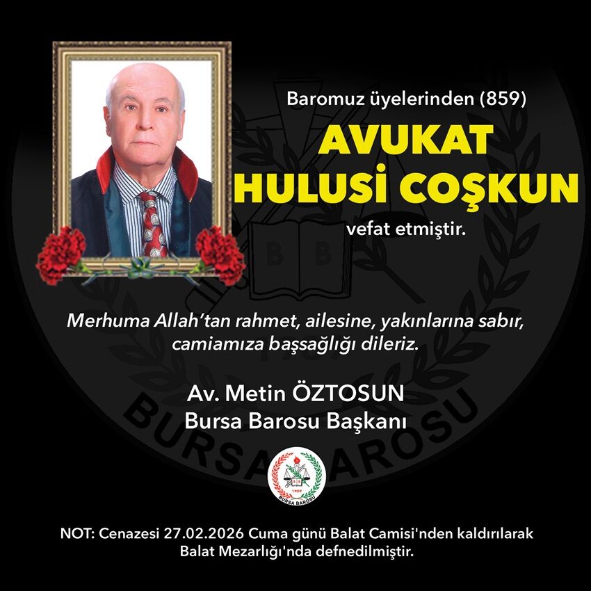 Bursa Barosu'na kayıtlı Avukat Hulusi Coşkun (859) vefat etti.