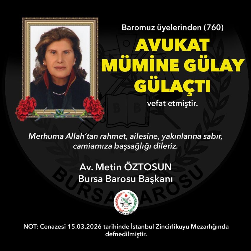 Bursa Barosu'na kayıtlı Avukat Mümine Gülay Gülaçtı (760) vefat etti.