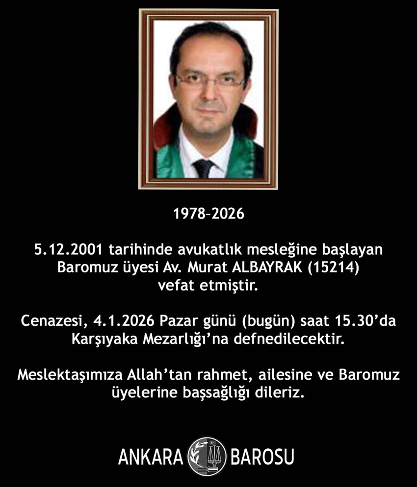 5.12.2001 tarihinde avukatlık mesleğine başlayan Baromuz üyesi Av. Murat ALBAYRAK (15214) vefat etmiştir.