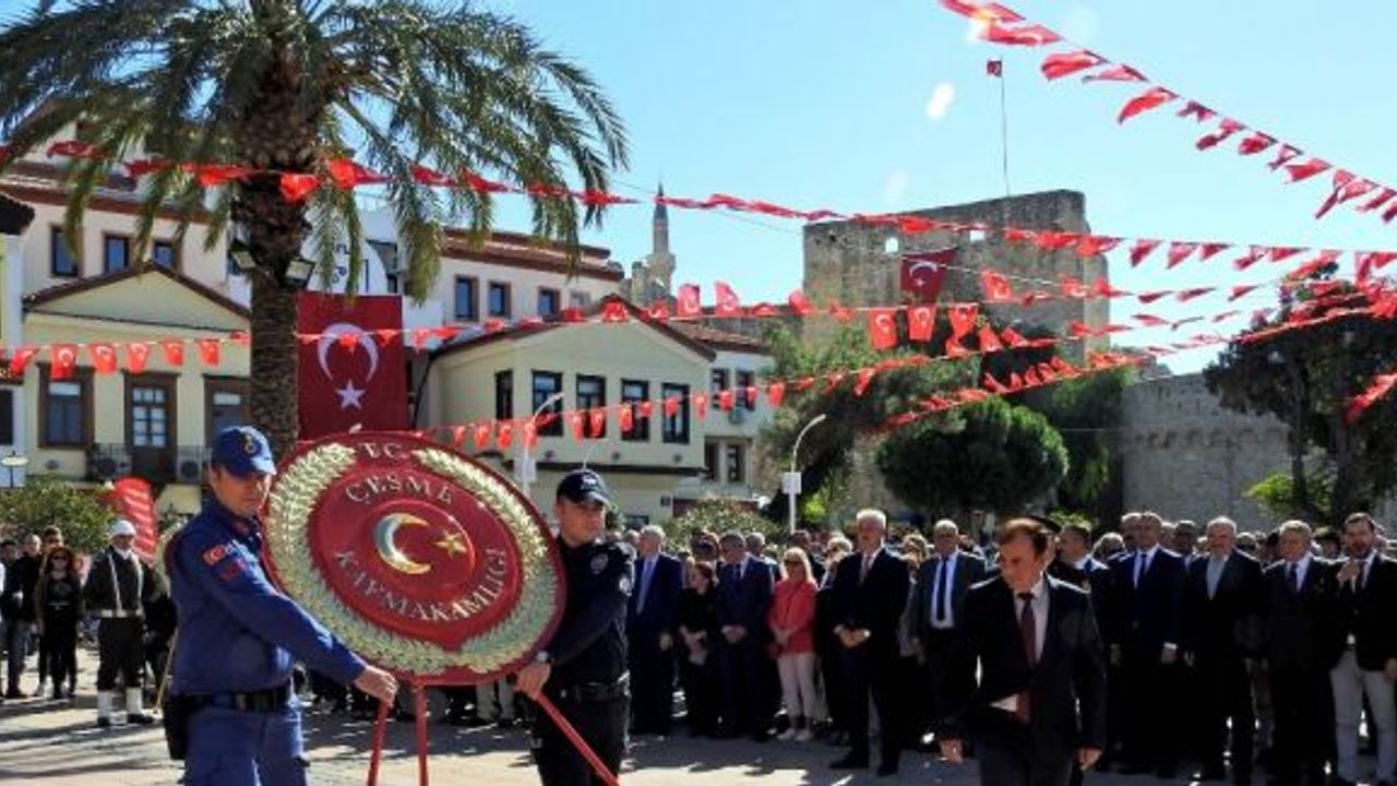 İzmir’in Çeşme ilçesinde, 29 Ekim Cumhuriyet Bayramı’nın 95. yılı kutlamaları, Atatürk Anıtı’na çelenk sunulması ile başladı.