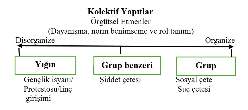 Bu kişiler, toplumsal normları benimseyememiş, ilkel adaletsizlik duyguları/küs olgusunun egemen, kültürel çatışma içinde, kendilerine karşı beslenen önyargı veya ayrımcı işlemler nedeniyle oluşan çeşitli uyum biçimlerine giren, rollerle özdeşleşen gençler bazen isyankâr yığınlara dönüşmekte, linç girişimlerine veya kapkaç türü suç işlemeye yönelmektedirler. Bu kolektif birlikteliği, örgüt etmenleri, dayanışma, norm benimseme ve rol tanımını göz önüne alarak şu gelişim çizgisinde gösterebiliriz: