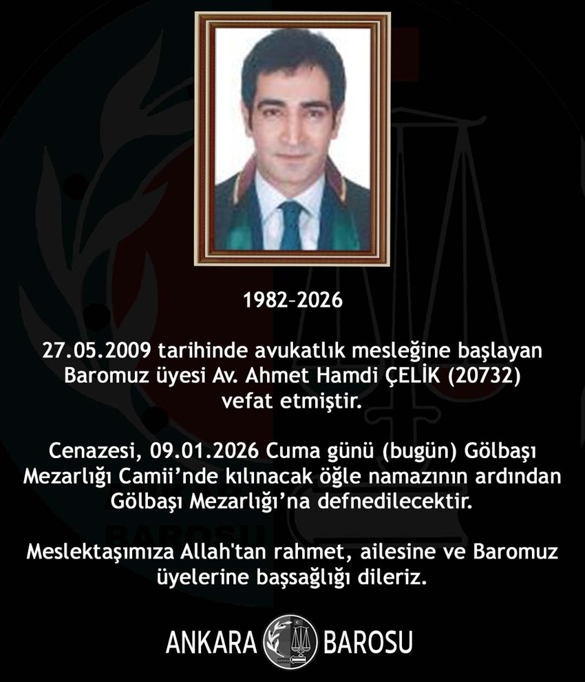 27.05.2009 tarihinde avukatlık mesleğine başlayan Baromuz üyesi Av. Ahmet Hamdi ÇELİK (20732) vefat etmiştir.