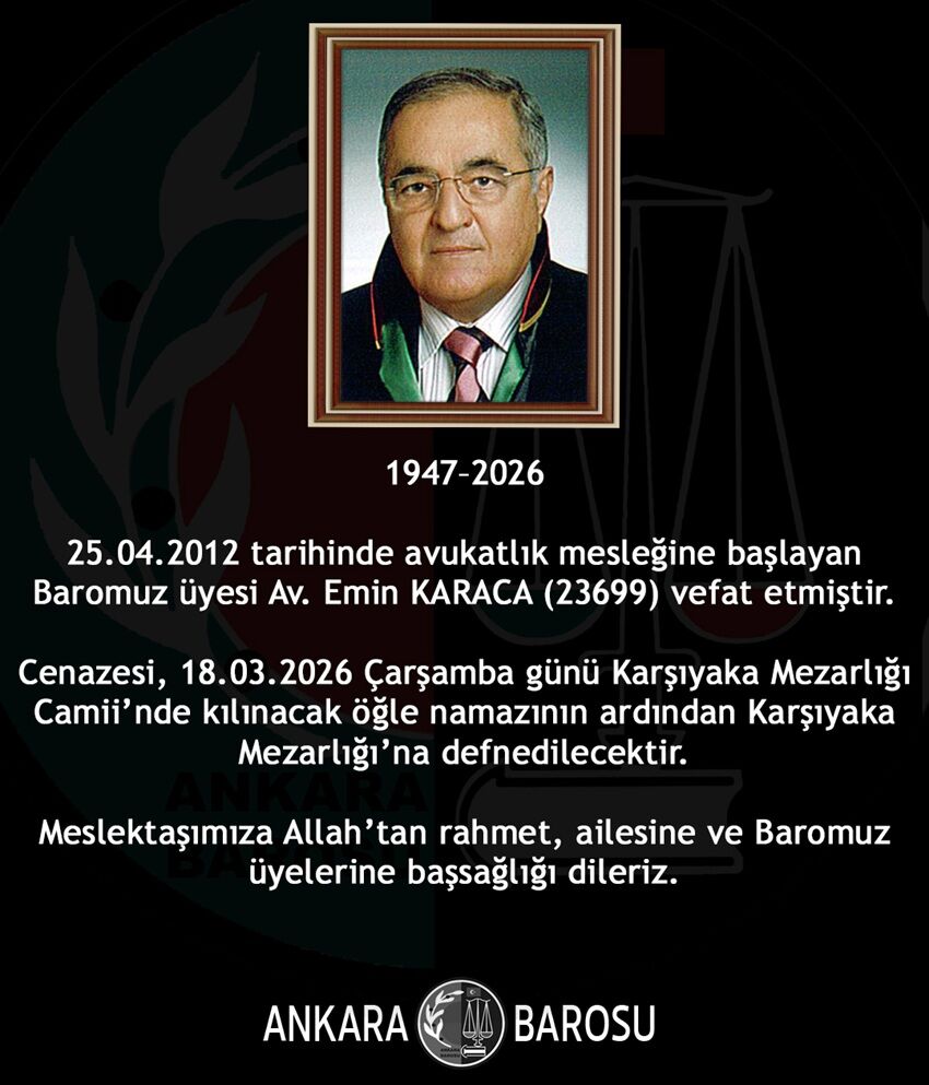 BAROMUZ ÜYESİ AV. EMİN KARACA (23699) VEFAT ETMİŞTİR.