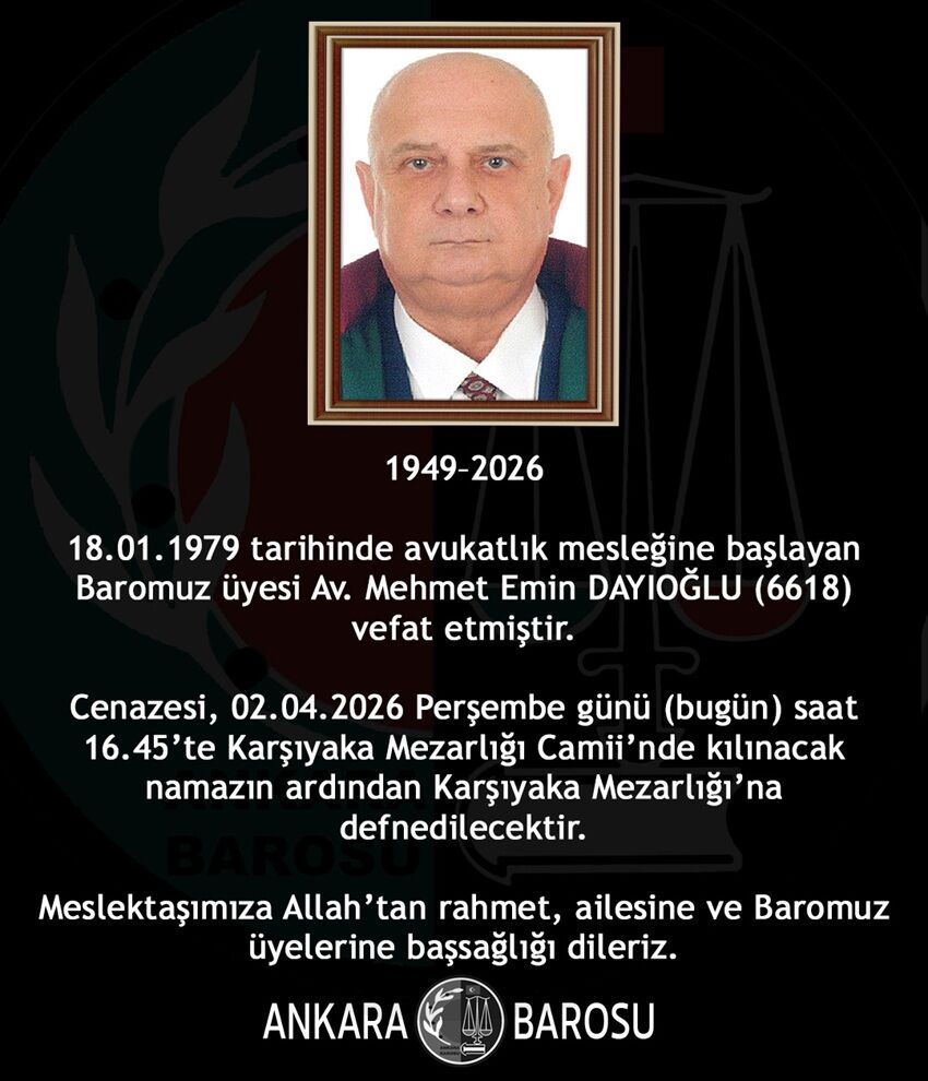 Cenazesi, 02.04.2026 Perşembe günü (bugün) saat 16.45’te Karşıyaka Mezarlığı Camii’nde kılınacak namazın ardından Karşıyaka Mezarlığı’na defnedilecektir.