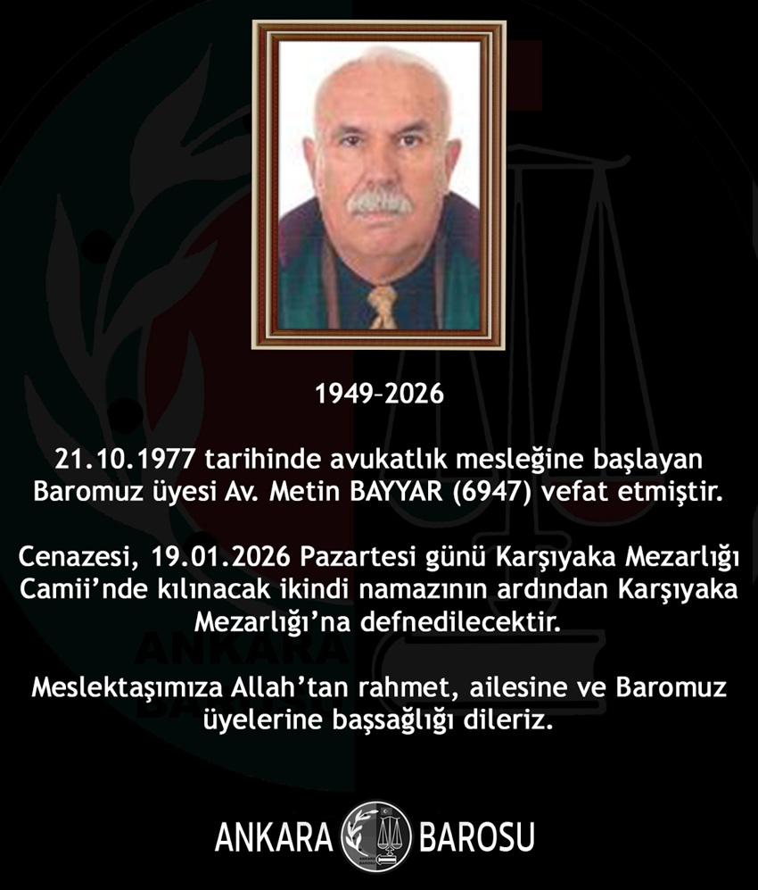 21.10.1977 tarihinde avukatlık mesleğine başlayan Baromuz üyesi Av. Metin BAYYAR (6947) vefat etmiştir.