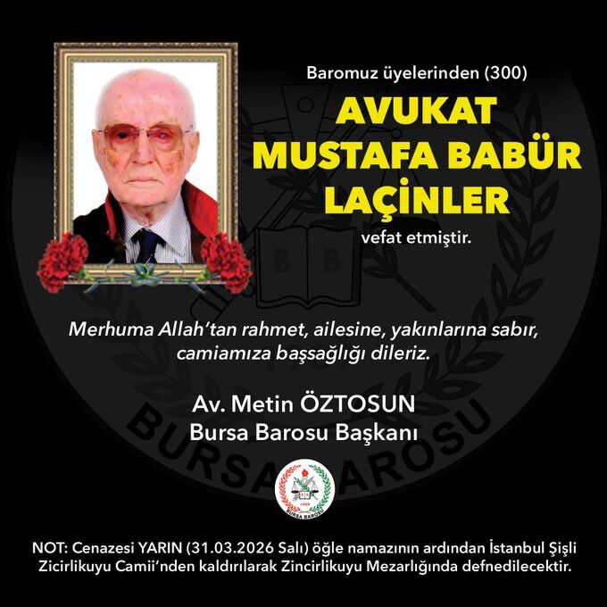 Bursa Barosu'na kayıtlı Avukat Mustafa Babür Laçinler (300) vefat etti.