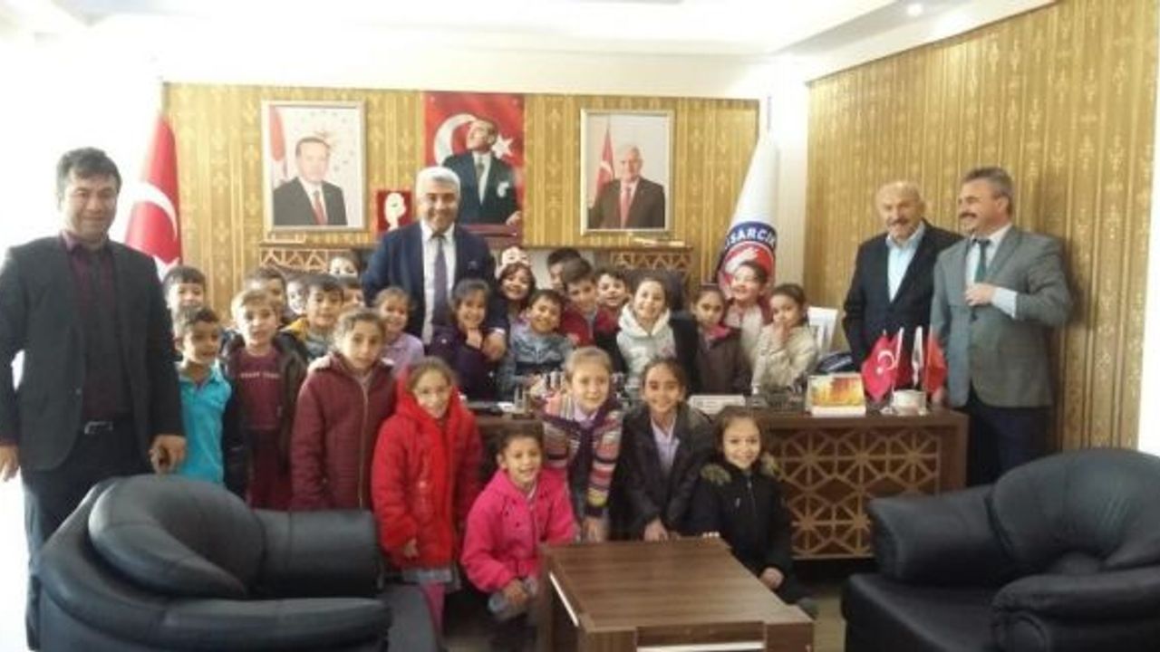 Sınıf Öğretmenleri Şevket Şen ve Ali Sevinç ile birlikte Belediye Başkanı Fatih Çalışkan’ı makamında ziyaret eden 3. sınıf öğrencileri okul bahçelerine çocuk parkı yapılması için dilekçe sundular.