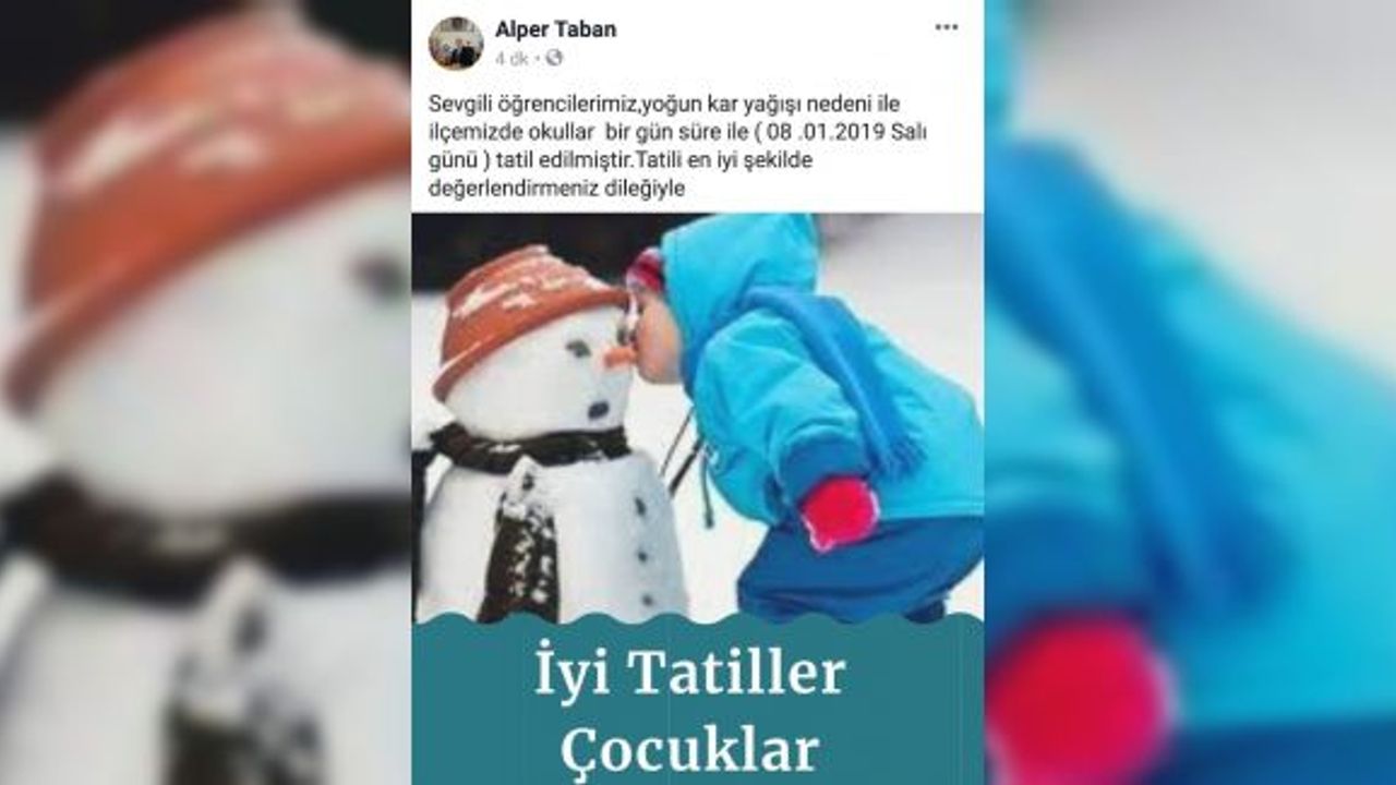 İnegöl Belediye Başkanı Alper Taban ise sosyal medyadan paylaştığı mesajda öğrencilere kar tatilini duyurdu. İyi tatiller çocuklar fotoğrafıyla paylaşım yapan Başkan Taban, "Sevgili öğrencilerimiz,yoğun kar yağışı nedeni ile ilçemizde okullar bir gün süre ile ( 08 .01.2019 Salı günü ) tatil edilmiştir.Tatili en iyi şekilde değerlendirmeniz dileğiyle" dedi.
