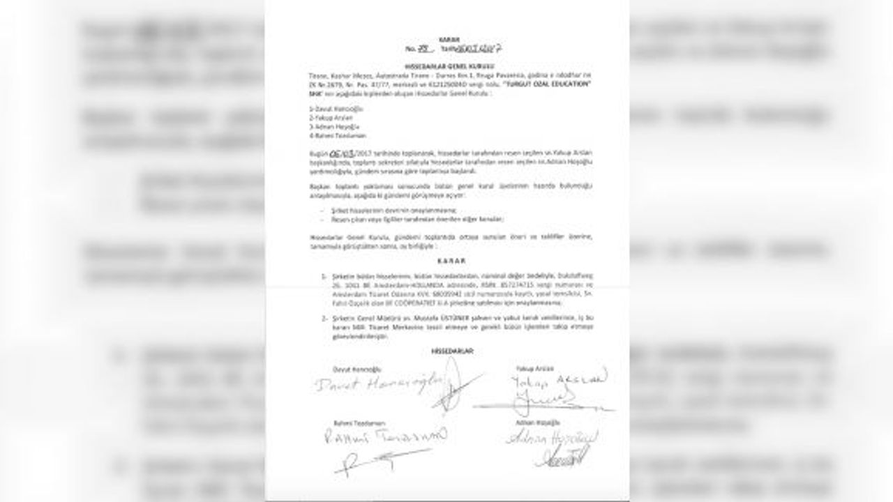 AA muhabirinin Arnavutluk Milli Ticaret Merkezinden edindiği belgeye göre, FETÖ'ye ait Turgut Özal kolejinin hissedarlarından Davut Hancıoğlu, Yakup Arslan, Adnan Hoşoğlu ve Rahmi Tozduman'ın 6 Mart 2017'de yaptıkları toplantıda kolejin hisselerinin Hollanda merkezli BF Cooperatief UA şirketine devredilmesine karar verildi.