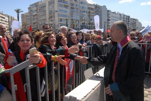 Avukatların 'Türkiye Adaletini Arıyor' mitingi, İzmir Cumhuriyet Meydanı'nda Atatürk Anıtı'na çelenk konulmasıyla başladı. Daha sonra, TBB Başkanı Metin Feyzioğlu, İstanbul Baro Başkanı Ümit Kocasakal, İzmir Baro Başkanı Aydın Özcan, Ankara Baro Başkanı Hakan Canduran ile binlerce avukat kol kola Gündoğdu Meydanı'na doğru yürümeye başladı.