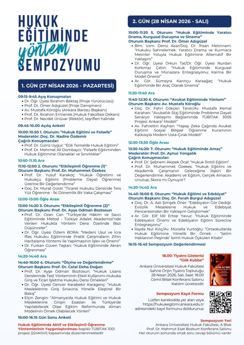 Son yıllarda hukuk eğitiminde yöntem tartışmasının kurumsal biçimde görünür hale gelmesi de bu ihtiyacı doğrulamaktadır. Ankara Üniversitesi Hukuk Fakültesi bünyesinde yürütülen “Hukuk Eğitiminde Aktif ve Etkileşimli Öğrenme Yöntemlerinin Yaygınlaştırılması” başlıklı TÜBİTAK 1001 projesi ile 27–28 Nisan 2026 tarihlerinde düzenlenen “Hukuk Eğitiminde Yöntem Sempozyumu”, hukuk öğretiminde klasik anlatım merkezli modelin artık yeterli görülmediğini göstermektedir. Aynı proje çerçevesinde hukuk klinikleri, yaratıcı drama, simülasyon, ters yüz öğrenme ve akran öğrenmesi gibi yöntemlerin ayrıca öne çıkarılması da bu arayışın tesadüfî değil, sistematik olduğunu ortaya koymaktadır.