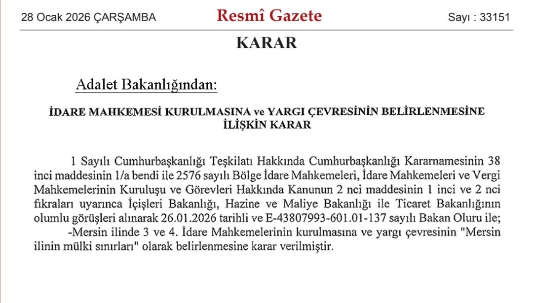 Adalet Bakanlığı tarafından alınan İdare Mahkemesi Kurulmasına ve Yargı Çevresinin Belirlenmesine İlişkin Karar ile Mersin ilinde 3 ve 4. idare mahkemelerinin kurulmasına ve yargı çevresinin Mersin ilinin mülki sınırları olarak belirlenmesine karar verildi.