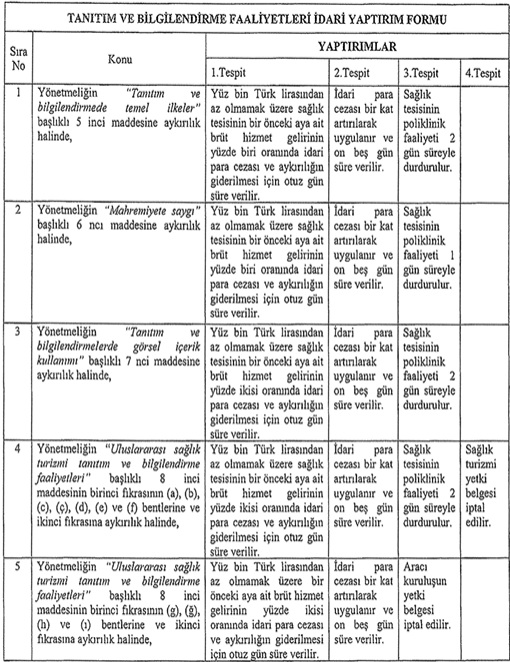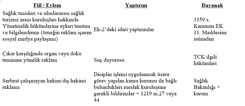 Yaptırımları bu şekilde genel bir çerçevede ele aldıktan sonra idarenin bu düzenleyici işlemle yukarıda ifade ettiğimiz üzere çoklu bir mekanizma ile pro-aktif bir mücadele yürütmek istediğini anlayabiliriz. Dolayısıyla yönetmeliğin ikinci bölümünde 5 madde halinde (5,6,7,8,9. Maddeler) ifade edilen ve bir başka yazıda detaylı bir şekilde ele almayı düşündüğümüz hususların ihlali halinde ciddi yaptırımlarla karşı karşıya olunduğu bilinmelidir. Yine bu meyanda belirtilmelidir ki yönetmeliğin “Uluslararası sağlık turizmi tanıtım ve bilgilendirme faaliyetleri” başlığını taşıyan 8. Maddesi yeni bir düzenlemedir ki belirli şartlar dahilinde sponsorlu tanıtım ve bilgilendirme faaliyetine izin vermektedir. Bu madde ile birçok yeni husus da düzenleme altına alınmıştır.