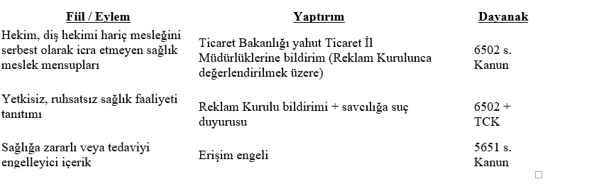 Yönetmelikte Yaptırımlar 12. Maddede düzenlenmiştir. Buna göre Yönetmelik, yaptırımların dayanağını yalnızca kendi normatif alanından değil, 3359 sayılı Sağlık Hizmetleri Temel Kanunu ek 11. madde, 5237 sayılı TCK, 6502 sayılı Tüketicinin Korunması Hakkında Kanun, 5651 sayılı Kanun ve 6698 sayılı KVKK gibi beş farklı mevzuat üzerinden kurar.