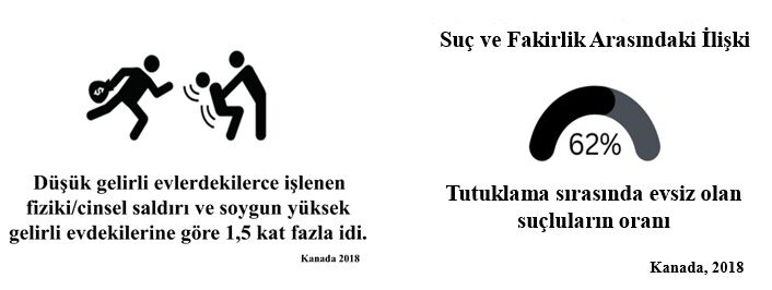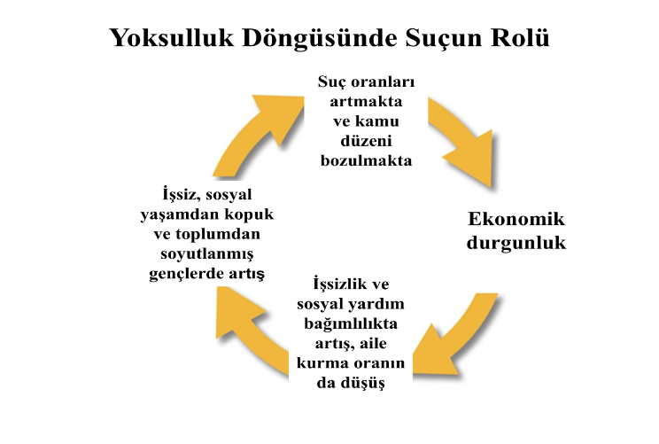Özetle, suçun başlıca nedenlerinin yoksulluk ve eşitsizlikle bağlantılı olduğu göz ardı edilmemelidir. Yoksulluğun seyrini durduracak imkânlar vücut bulmalıdır. Siyaset yapıcılar, bu olguya karşı gerekli adımları atmak için bu motivasyonları dikkate almalı; düşük gelirli yörelere/nüfuslarına odaklanıl- malıdır. Araştırmalara göre, suç ve yoksulluk birbirini tamamlayıcı bir örüntü sergiliyor gibi görünmektedir. Yıllar boyunca, hapsedilen bireyler ile düşük gelirli hanelerde yaşayan veya mali istikrarsızlık içinde olan kişiler arasındaki örtüşme şaşırtıcı hiç de şaşırtıcı olmamıştır.