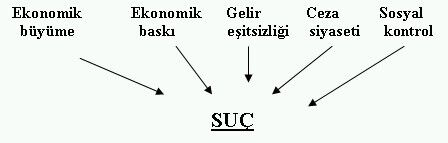 Bu modeldeki bağımsız değişkenlerden ekonomik büyüme, kişi başına düşen gayri safi milli hasılayı, ekonomik baskı, yüz bin erkek nüfusundaki işsizlik oranını, gelir eşitsizliği, gelir dağılımındaki eşitsizlik ve yoksulluğun yaygınlığını, ceza siyaseti, yüz bin nüfustaki cezaevi nüfus oranını, sosyal kontrol, yüz bin nüfustaki kolluk görevlisi sayısını ve suç terimi, kolluk güçlerince kayıtlara geçirilen tüm suçları karşılamaktadır.